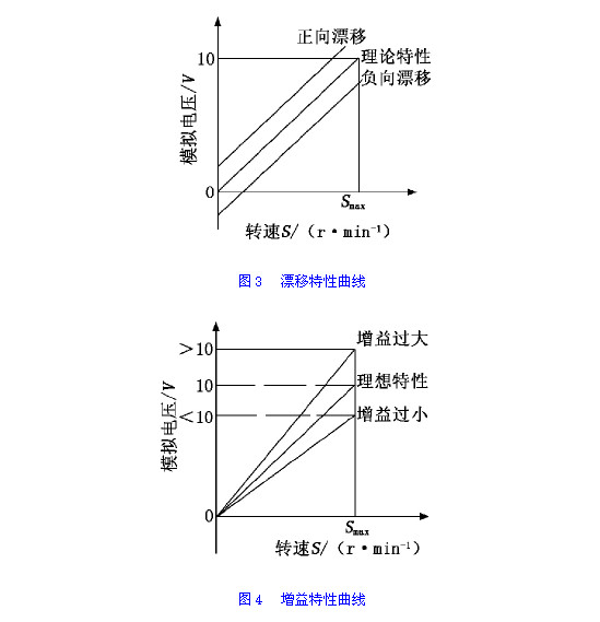 模擬量輸出的漂移特性曲線如圖3所示,調(diào)整漂移參數(shù)可改變轉(zhuǎn)速S0所對(duì)應(yīng)的電壓輸出值,使特性曲線上下平移。本例中漂移參數(shù)設(shè)定為0時(shí),實(shí)測(cè)S0轉(zhuǎn)速對(duì)應(yīng)電壓為-0.048V,特性曲線為負(fù)向漂移曲線。經(jīng)計(jì)算和設(shè)定漂移參數(shù)后,再次實(shí)測(cè)漂移電壓為-0.002V,基本接近于0V,特性曲線基本接近理想特性曲線。