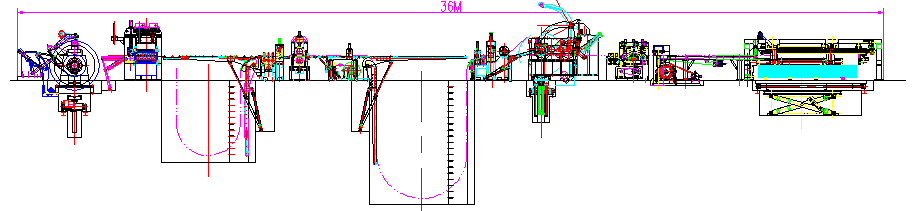 運(yùn)料→上卷→開卷→引料直頭→矯平→活套→導(dǎo)向?qū)χ小v剪→收廢絲→活套→預(yù)分料阻尼→壓分料→收卷機(jī)→出料小車→導(dǎo)向?qū)χ小C定尺→橫