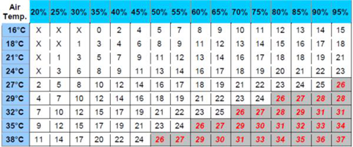 露點表根據(jù)濕度和溫度給出露點溫度(C),冷卻水必須高于露點溫度以防止結(jié)露。